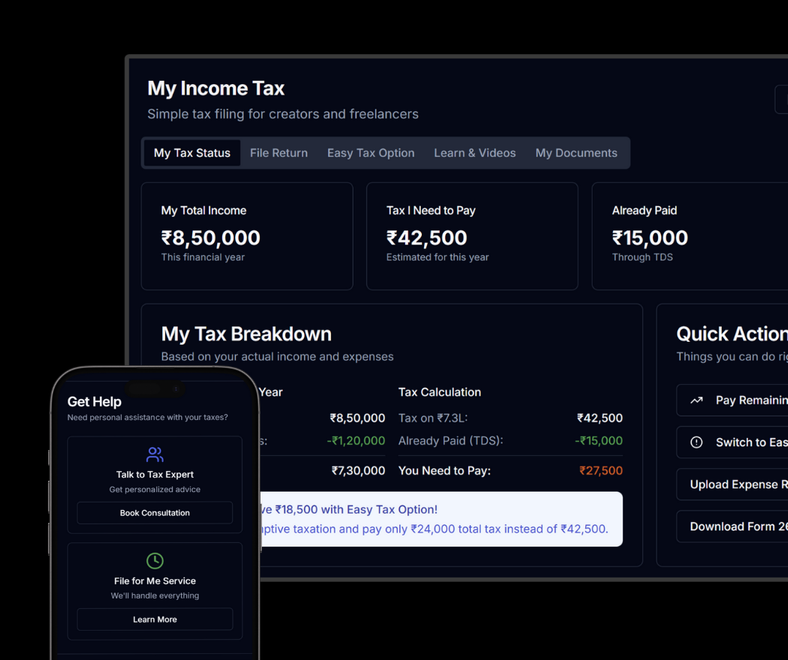 Handle GST, TDS, and income tax with a mix of smart automation and real human help — designed for freelancers and creators.