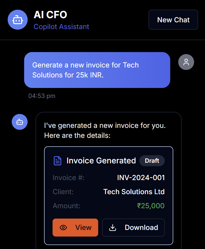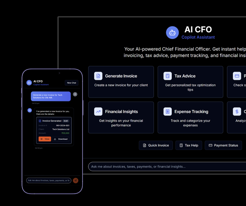 It acts like your personal finance assistant – helping you raise invoices, answer tax questions, track payments, and get real-time insights, all through a simple chat interface.