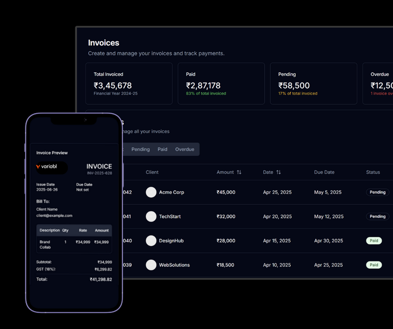 From raising invoices to tracking income, managing taxes, and getting real-time financial insights. Variabl is your intelligent, AI-first financial copilot.